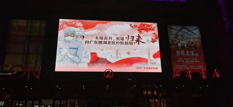 據(jù)初步統(tǒng)計,佛山印象城、鉑頓城、城央大廈、百花廣場、南海環(huán)宇城、南海越秀悅匯天地、順峰山公園、順德德勝文化廣場、高明荷城廣場、高明世紀廣場、三水雙子星未來城、三水新動力廣場等多家單位響應(yīng),全市70多處地標,100多塊大屏,屏幕滾動播放“歡迎戰(zhàn)疫英雄回家”宣傳畫及宣傳標語。